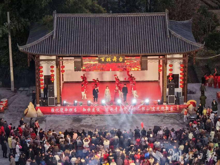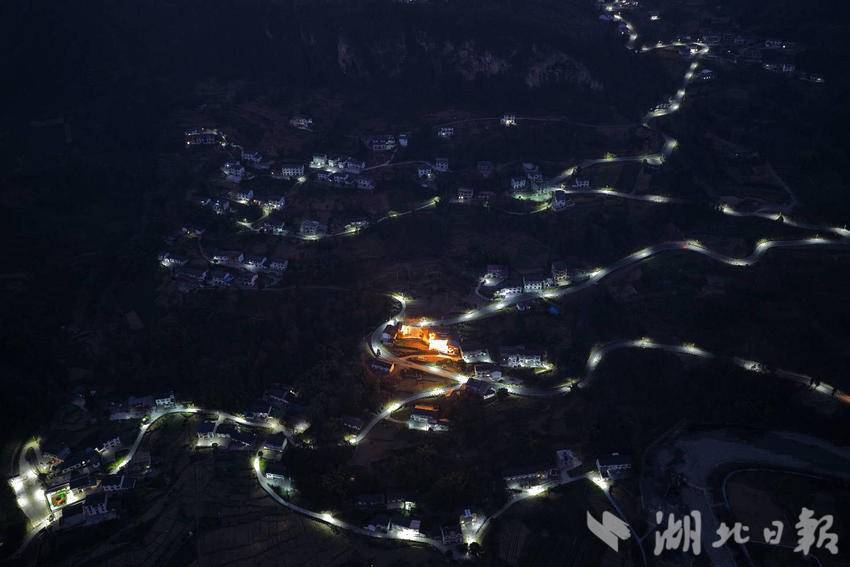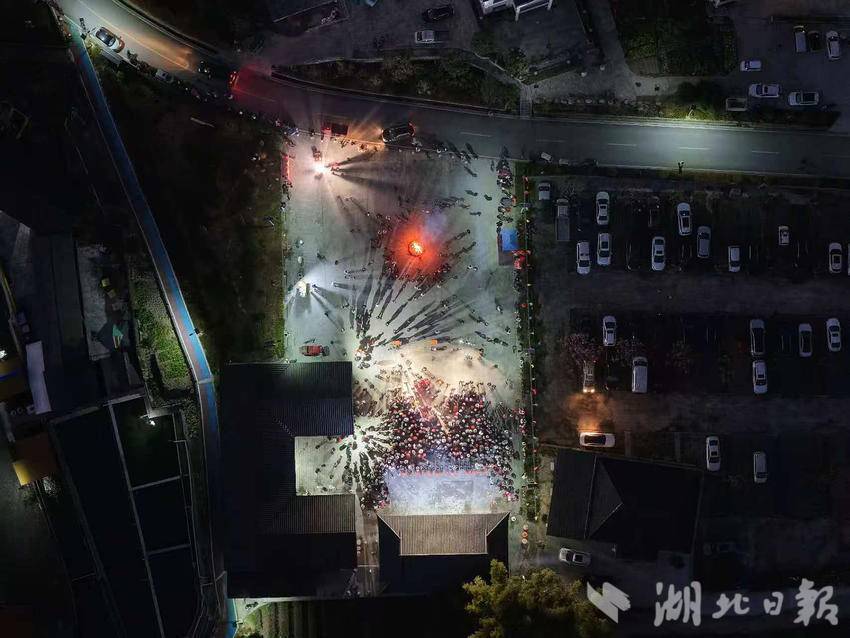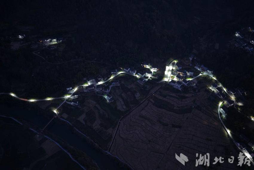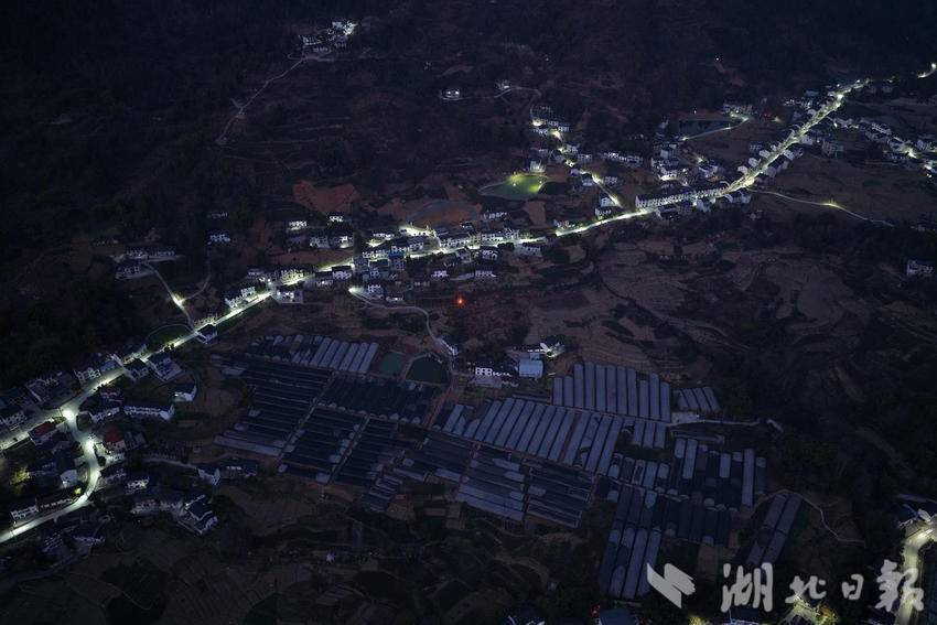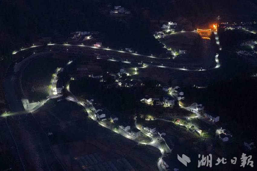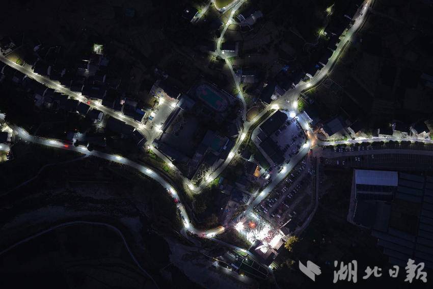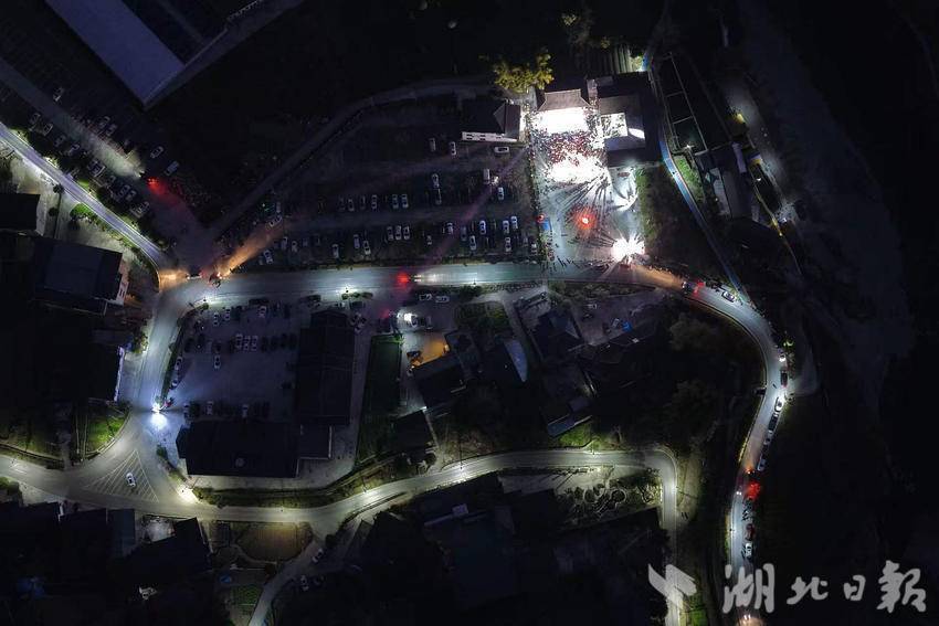航拍视角下,山村美如画卷。绵延路灯宛若银丝带,缠绕青山绿水,串联民居、景区、大棚与村落,汇成璀璨星河。文化广场上灯火通明、红光跃动,男女老少围聚一堂,自编歌舞、小品轮番登场,乡音乡语里烟火气升腾,掌声笑声回荡山谷。