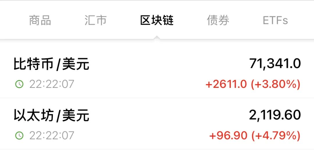 截至发稿,比特币涨至71341.0美元/枚,现涨3.8%。